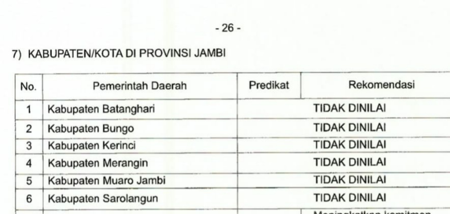 Diantara delapan kabupaten/kota yang tidak dinilai kemendagri adalah; Kabupaten Batanghari, Bungo, Kerinci, Merangin, Sarolangun, Muaro Jambi, Kota Jambi dan Sungaipenuh.