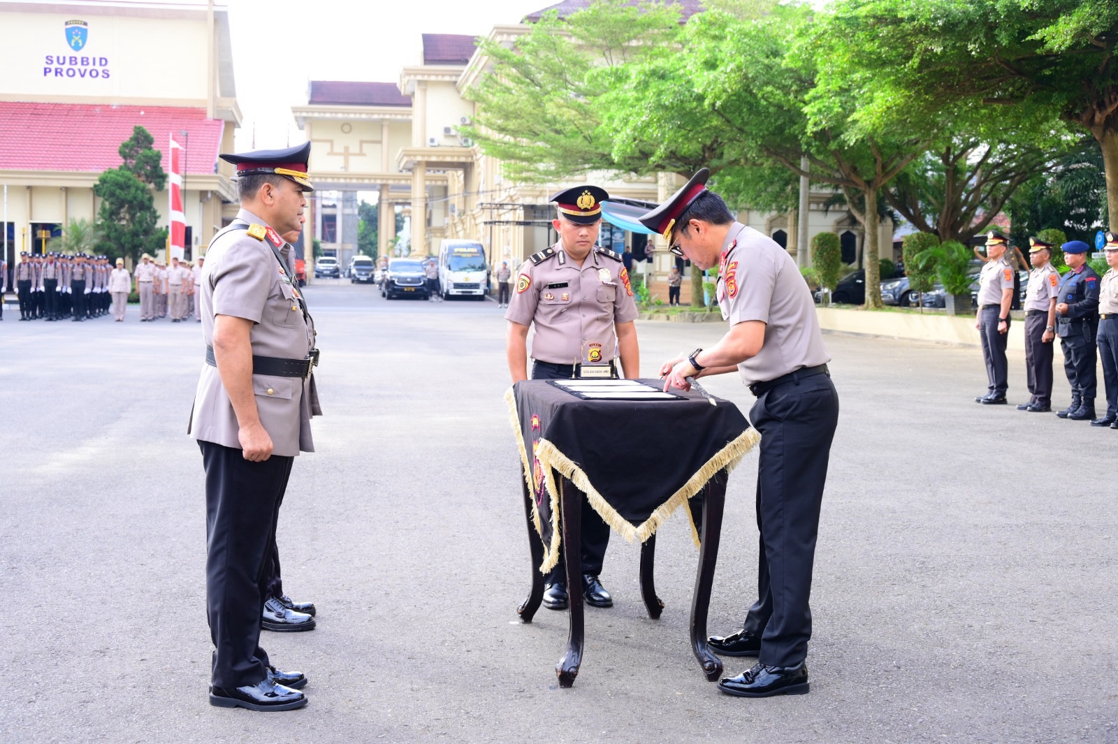 Rangkaian kegiatan dilanjutkan dengan penandatanganan naskah berita acara serah terima jabatan, berita acara sumpah jabatan, serta pakta integritas sebagai bentuk komitmen pejabat baru dalam menjalankan amanah tugas. Acara ditutup dengan pembacaan doa dan laporan akhir kepada Inspektur Upacara.