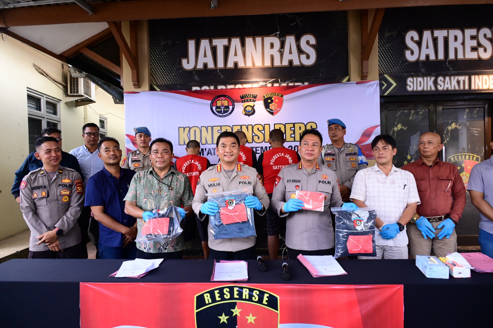 JAMBI – Kabid Humas Polda Jambi Kombes Pol. Mulia Prianto di dampingi oleh Kapolresta Jambi, Kombes Pol. Boy Siregar melaksanakan konferensi pers ungkap kasus pencurian dengan pemberatan, yang dilakukan saat aksi unjuk rasa DPR pada tanggal 29 Agustus 2025.