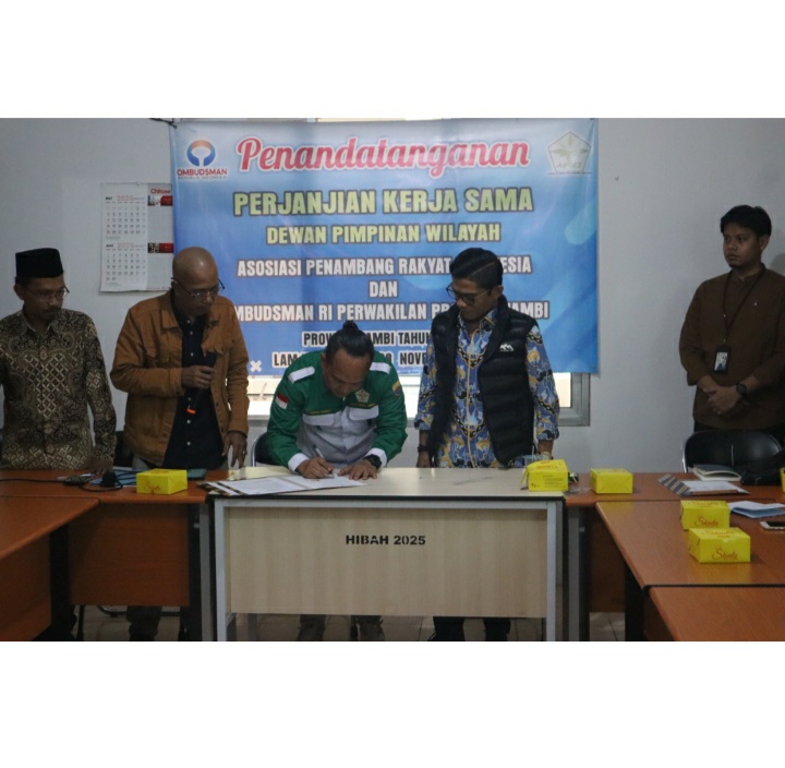 JAMBI – Perwakilan Ombudsman RI Provinsi Jambi, menjalin kerjasama dengan Dewan Pengurus Wilayah (DPW) Asosasi Penambang Rakyat Indonesia (APRI) Provinsi Jambi. Penandaganganan PKS ini dilaksanakan pada 28 November 2025, di Gedung Balai Adat Kota Jambi.