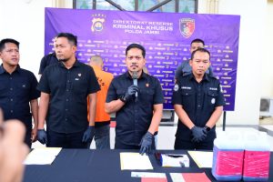 JAMBI – Direktorat Reserse Kriminal Khusus Polda Jambi menggelar konferensi pers terkait ungkap kasus dugaan tindak pidana di bidang Migas, yang disampaikan